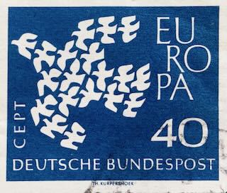 Німецька марка EUROPA, яку я вам сьогодні показую, була розроблена голландським художником Тео Курперсхуком (1914-1998). Багато маленьких птахів утворюють одного великого голуба. Чудове зображення.