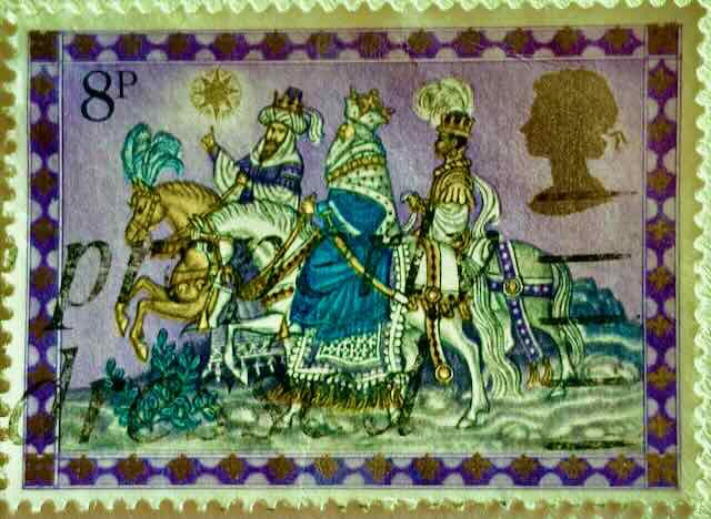 Праздник Богоявления отмечается во всем мире. Даже на почтовых марках изображены эти таинственные люди. Обычно их изображают очень образно. Сегодня я хотел бы показать вам британскую марку с тремя царями, направляющимися в Вифлеем. Величественный всадник во главе указывает на небо, на звезду, которая ведет группу в Вифлеем.