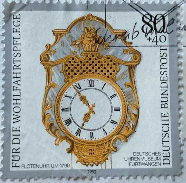 die heutige deutsche Briefmarke zeigt eine Flötenuhr. Diese Uhren sind kostbare Kunstwerke. Sie zeigen nicht nur die Tageszeit, sondern spielen zu einer bestimmten Uhrzeit auch eine schöne Melodie.