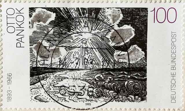 heute möchte ich Ihnen eine Briefmarke mit einem Gemälde des deutschen Künstlers Otto Pankok zeigen. Sonne und Meer, ist der Titel des Bildes. Sehr schön zeigt der Maler, wie die Sonnenstrahlen die Wolken beiseiteschieben. Die Sonne spiegelt sich im Meer. Solche wunderschönen Erlebnisse kennen Sie vielleicht auch aus Ihrem Leben. Augenblicke, in denen man lange verweilen möchte. Momente, in denen die Seele neue Kraft tanken kann. Da spiegelt sich die Sonne nicht nur in den sanft rauschenden Wellen, sondern auch in den Gedanken und Gefühlen.