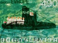 Die heutige Briefmarke ist ein Stück Zeitgeschichte. Sie stammt aus dem ehemaligen Jugoslawien im Südosten Europas. Durch Kriege im Jahr 2002 zerfiel das Land in sechs Staaten. Jugoslawien war nur noch Geschichte. Genauso wie die Briefmarke mit dem U-Boot YU 12. An Deck salutieren Matrosen in weißer Uniform. Das Bild könnte von einem Kind gemalt sein.